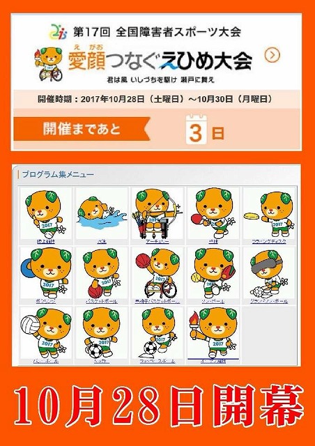 10月28日(土曜日)から30日(月曜日)まで、愛媛県松山市で開催される『第17回全国障害者スポーツ大会』の開会式に、県議会環境文化保健福祉委員会委員長として出席します。