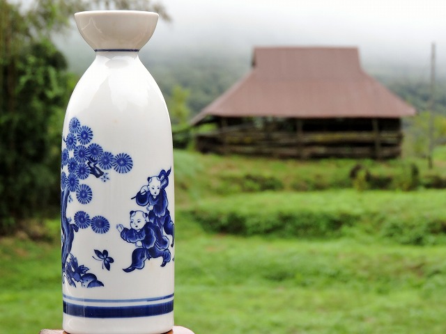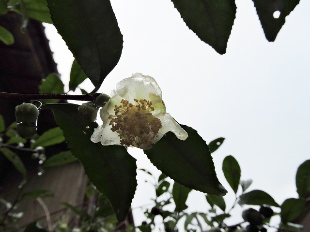 「朝のお散歩」、雨上がり。お茶の花も濡れている。ところで、近頃めっきり出番がなくなったお銚子(徳利)。それでも我が家の食器棚には、揃ってみんなで並んでる。秋は熱燗かな。