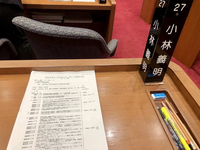 9時40分から開催された「自由民主党岡山県議団総会」に出席。10時から、「11月定例岡山県議会」再開。令和4年度一般会計予算案(314億3500万円)など32議案を原案通り可決、人事案件2件に同意して、閉会した。なお、途中本会議を休憩して開催された「総務委員会」に出席。