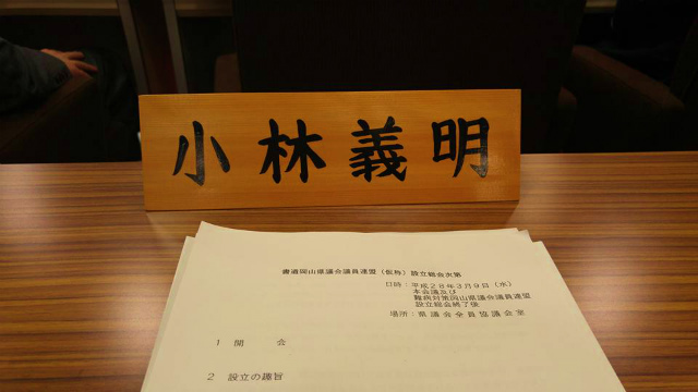 続いて、「書道岡山県議会議員連盟設立総会」に出席しました。会長に小野泰弘県議会議長、事務局長に蜂谷弘美自民党女性局長が就任されました。超党派の議連です。
