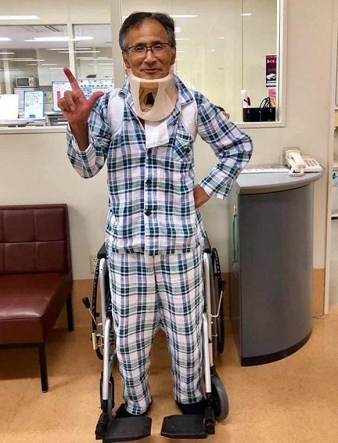 奥様のお許しを頂いて、お見舞いに伺いました。兄さん、リハビリ中でした。