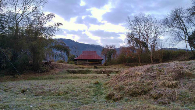 雪はないけれど冷え込んだ朝、我が家周辺であります。「朝のお散歩」、しばらく思索の曇り空。山水が気持ちのいいこと。