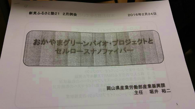 18時30分から「伯備」で開催された『新見ふるさと塾21・2月例会』に出席しました。講師は、岡山県産業労働部産業振興課主任の堀井裕二氏。テーマは、「おかやまグリーンバイオ・プロジェクトとセルロースナノファイバー」です。林業関係の皆様の出席が嬉しかったなぁ。