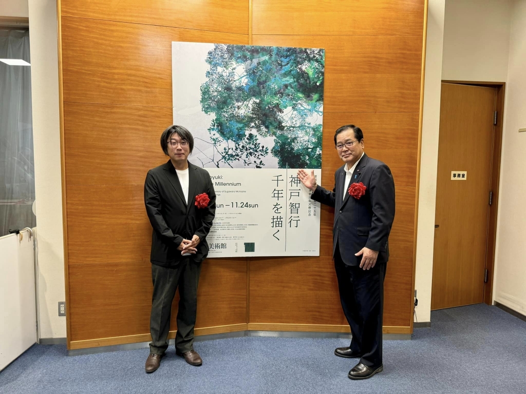 9時10分から、新見美術館で開催された「菅原道真公一千百二十五年太宰府天満宮式年大祭記念~神戸智行千年を描く~展」のオープニングセレモニーに出席しました。大宰府天満宮の西高辻信宏宮司様のご出席を頂いております。ご開催おめでとうございます。