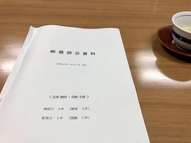 今日は、本会議の前に「協議」2件。10時から、「11月定例岡山県議会」。一般質問が始まりました。昼休憩時間に「自由民主党総務部会」。本会議散会後、「総務委員会」。その後、報道関係の写真撮影。それから帰宅でした。