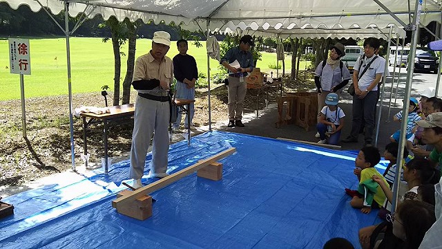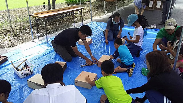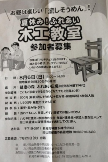 10時から「健康の森ふれあい広場」で開催された『第2回親子ふれあい木工教室』に出席しました。先生は、岡山県建設労働組合新見支部の皆様です。関係の皆様、親子で木に親しむ企画を作って頂きありがとうございます。また、開会行事で一言ご挨拶の機会を頂きました。ありがとうございました。