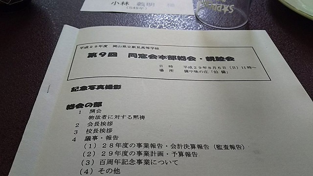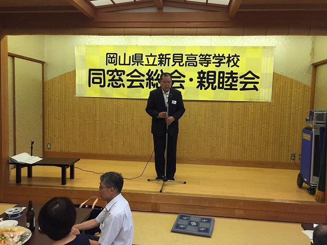 続いて、11時から「伯備」で開催された『平成29年度岡山県立新見高等学校第9回同窓会本部総会・懇親会』に出席しました。先輩諸兄多数ご出席でありましたが、県会議員として懇親会乾杯の音頭をとらせて頂きました。ありがとうございました。その際、合併により新たに新見高等学校が誕生した平成17年の新見市の出生数が296名であったのに対して、平成28年の出生数は174名であったことを紹介し、地域をあげて県立高等学校の在り方について意見を集約することが大切であることを申し上げました。