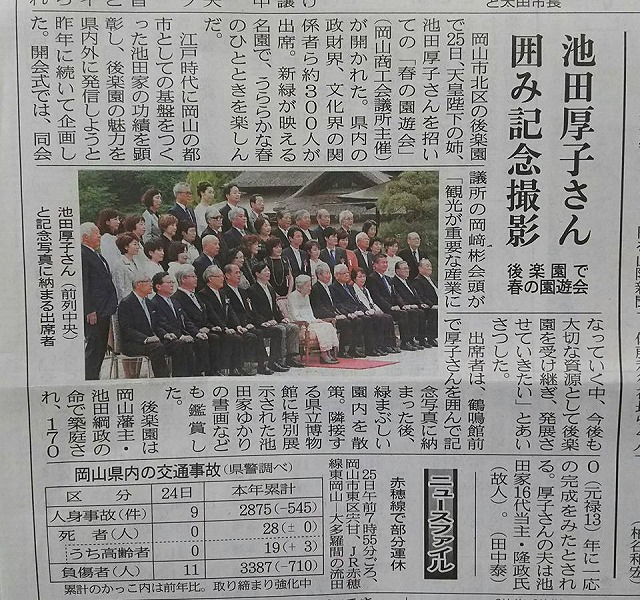 昨日の『岡山後楽園春の園遊会~池田厚子様を囲んで~』の様子が、山陽新聞朝刊で報じられている。