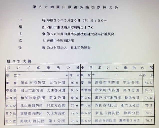 昨日20日㈰、「岡山県消防学校」で開催された『第65回岡山県消防操法訓練大会』の成績です。