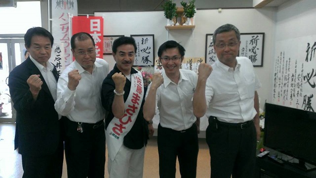 それでは、岡山県議団と記念写真ということで。頑張るぞポーズです。左から渡辺吉幸県議、小林義明、佐藤まさひさ立候補者、小林孝一郎県議、上田勝義県議です。