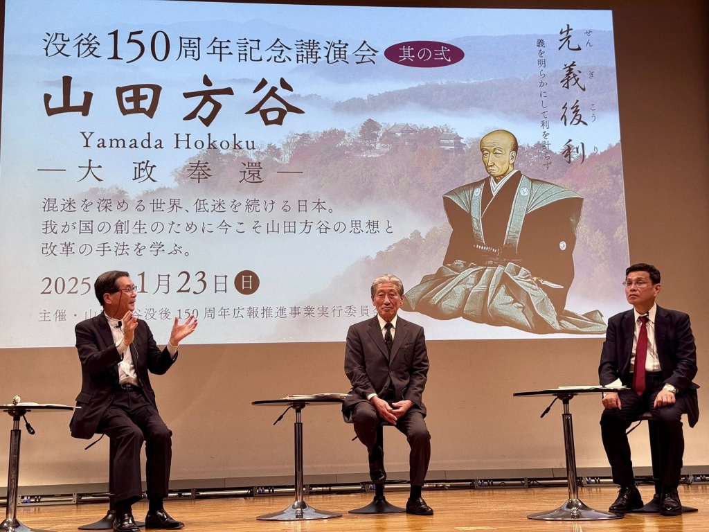 『山田方谷没後150周年記念講演会』でご講演いただいた徳川斉正氏、野島透氏、杉山慎策氏による『鼎談(ていだん・3人が向かい合って話し合うこと)』が行われました。