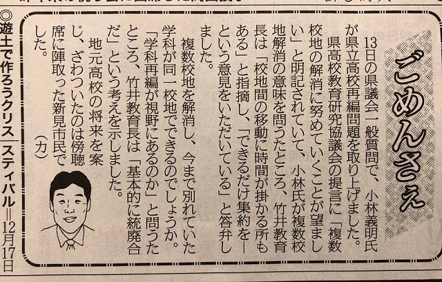 今朝の地元紙「備北民報」に、こんな感想がありました。寒い毎日が続きます。なにかにつけ、岡山と新見では温度差がありますね。