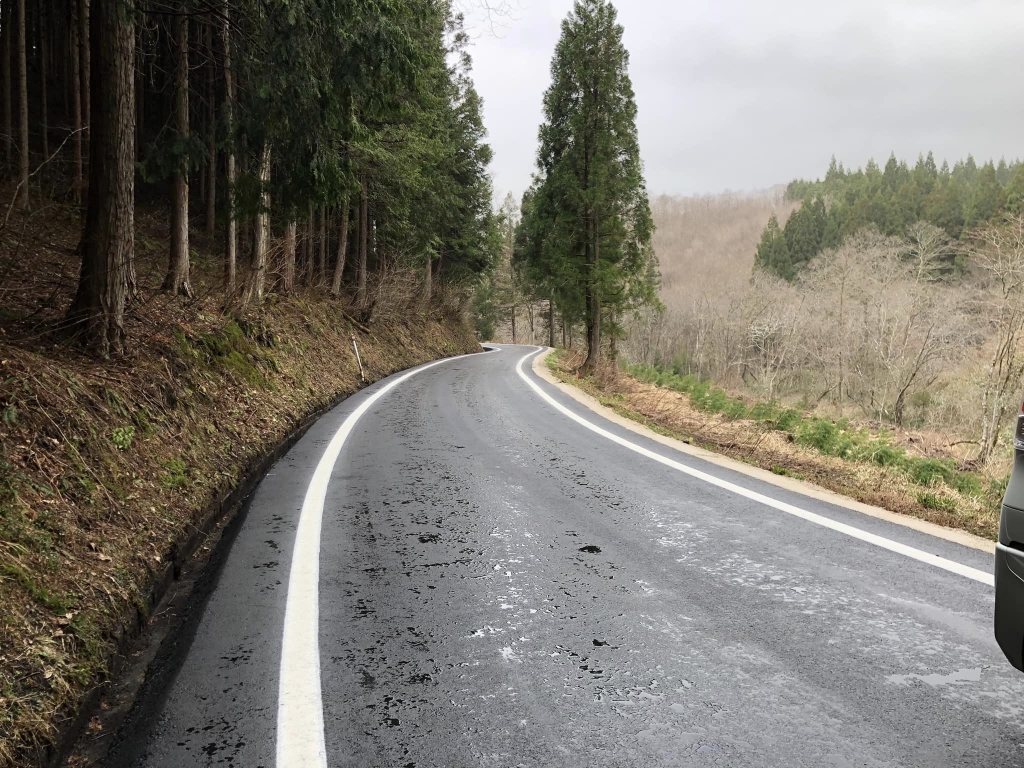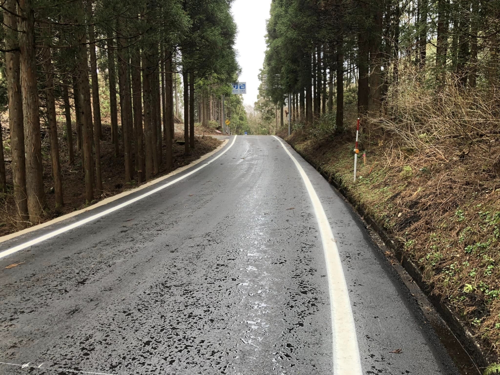 写真は、雪で延び延びになっていた君山地区の舗装工事現場です。お地元の方から「完了したよ」と連絡を頂いておりましたので、視察させて頂きました。関係の皆様、ありがとうございました。