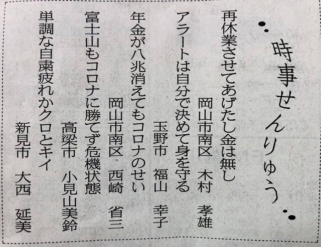 同級生大西延美さん、おめでとうございます。山陽新聞「時事せんりゅう」です。