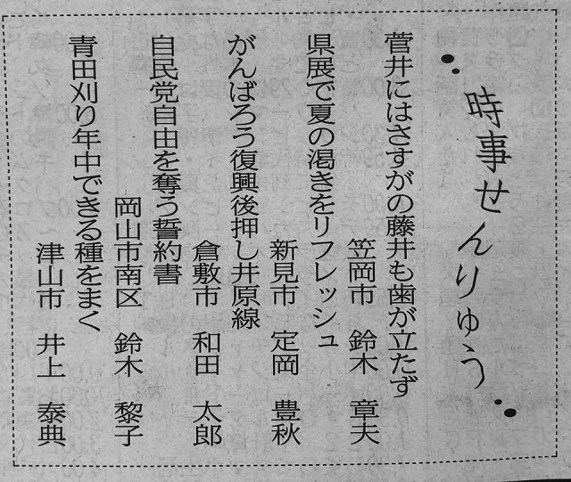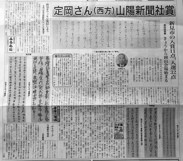 第69回県展、「山陽新聞社賞」の定岡豊秋先生はじめ入賞、入選された皆様、おめでとうございます。「桃花賞」の同級生大西延美さん、谷本晴子さん、おめでとうございます。今朝の「山陽時事せんりゅう」には定岡豊秋先生の川柳も。重ねてお祝い申し上げます。