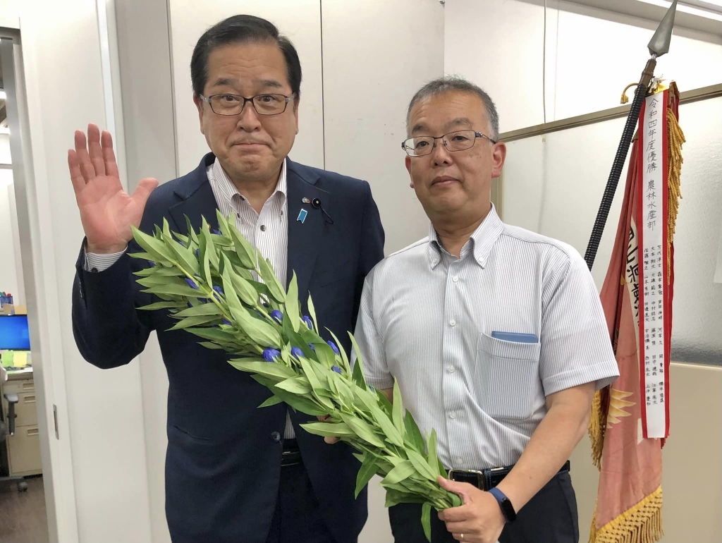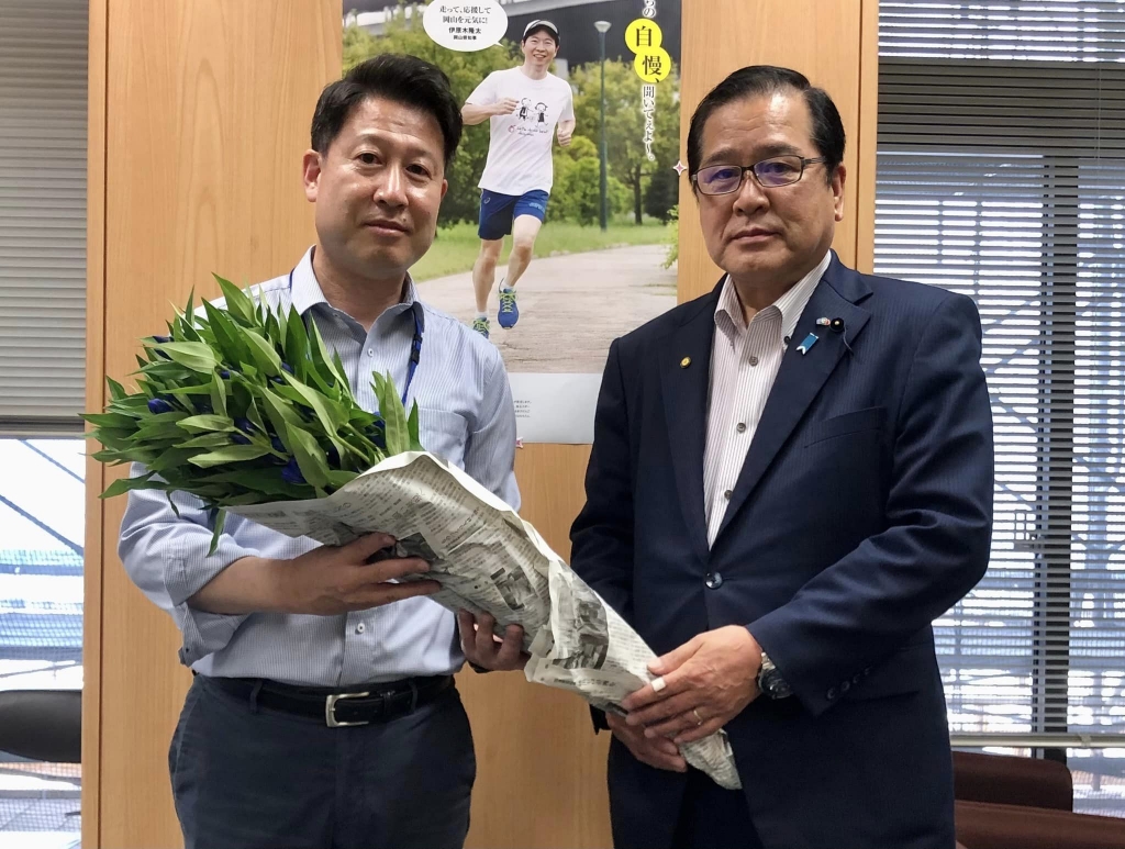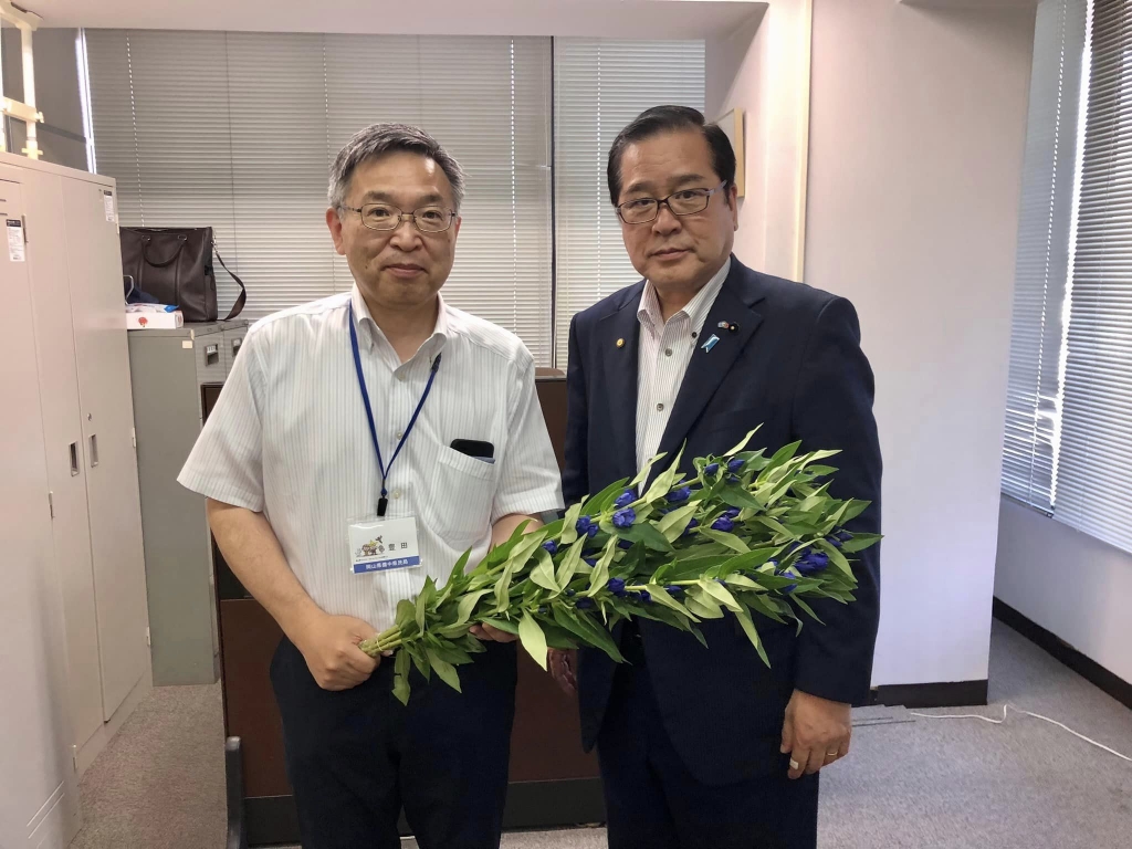 お届け頂いた西日本一の生産量を誇る新見産リンドウを持って岡山市へ移動。岡山県庁知事室を訪問して下野間室長に手渡し。続いて、ご支援を頂いている農林水産部を訪問して万代部長に手渡し。それから倉敷市へ移動して、備中県民局を訪問。豊田局長に手渡し。