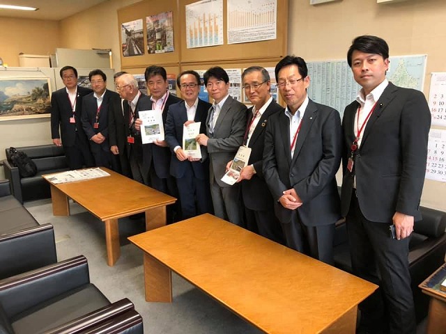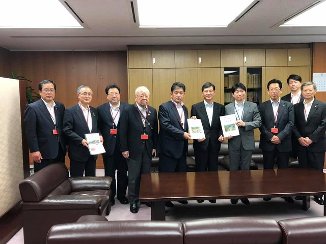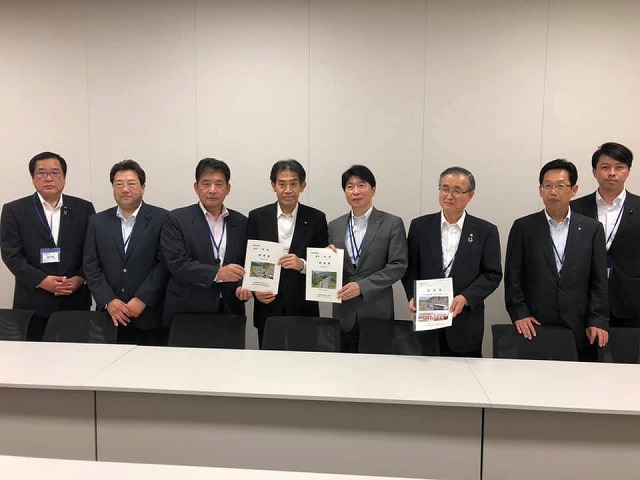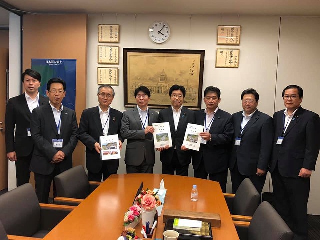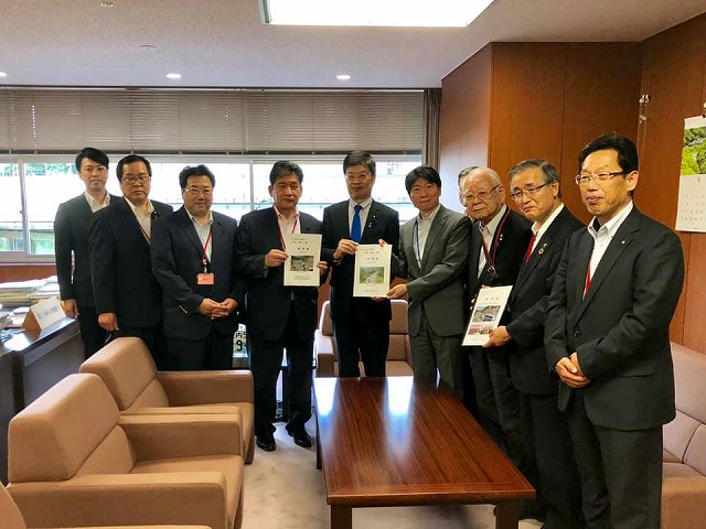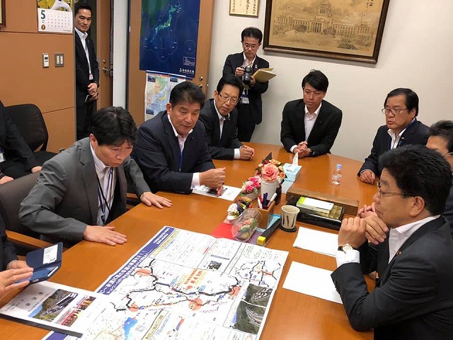 国土交通省でへ移動しての要望活動です。阿達政務官、由木審議官、池田道路局長です。