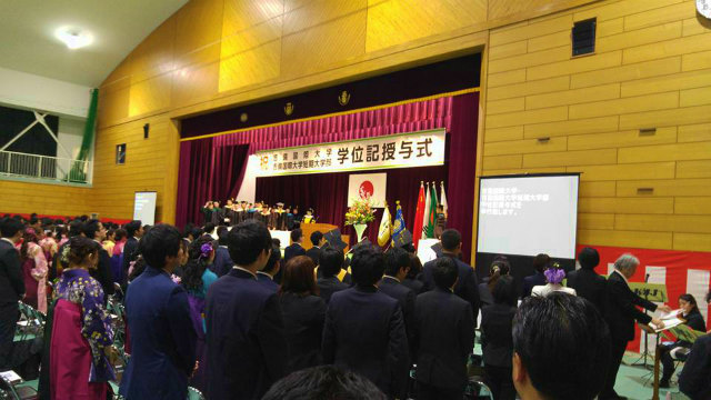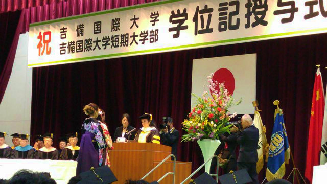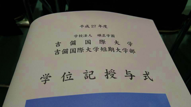続いて高梁市へ移動して、10時30分から『平成27年度吉備国際大学・吉備国際大学短期大学部学位記授与式』に出席しました。おめでとうございました。