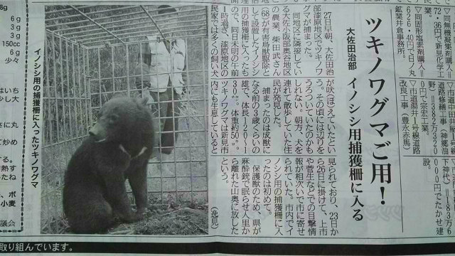 昨日の「新見市大佐田治部うるし原で熊捕獲」のお知らせが、今朝の地元紙のニュースになっている。