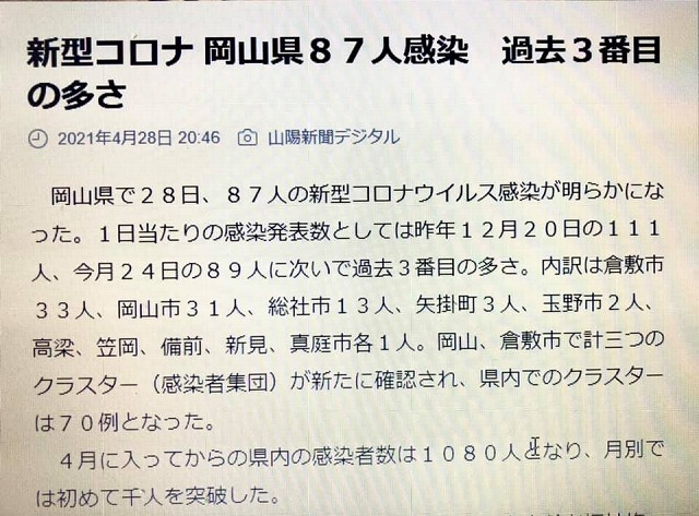山陽新聞が、新型コロナウイルス感染症の昨日の状況を伝えている。今日はまだ増えるかもしれない。冷静な対応をお願いします。