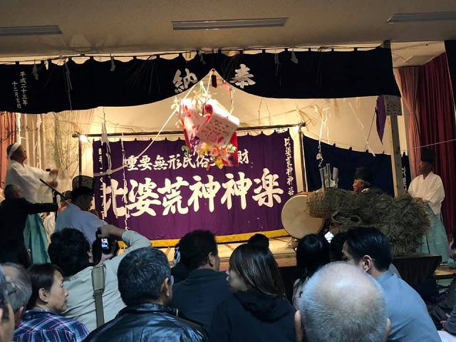 20時30分ごろ、13年に一度開催される『長作神楽(ヘビ神楽)』を拝見したいと「土橋交流センター」に伺いました。一言、ご挨拶の機会を頂きました。ありがとうございました。クライマックスは明日27日朝4時ごろとのことです。