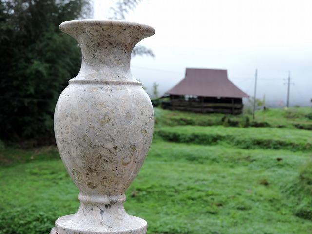 「よければ花など活けて下さい」と、この壺を届けて頂きました。「中国の桂林で購入したもので、壺の表面にはサンゴ、二枚貝などの化石が見られる」そうです。
