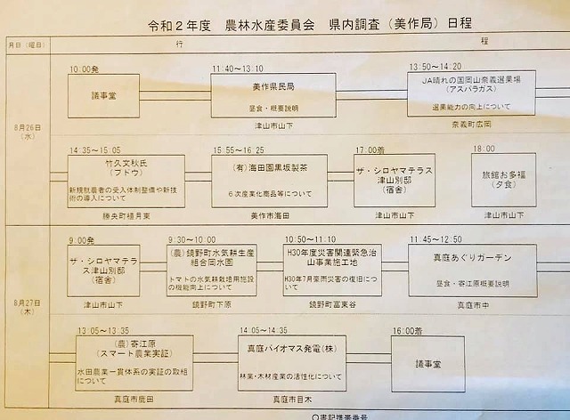 岡山県議会「農林水産委員会県内調査(美作県民局管内)」1日目の様子です。取り急ぎ。