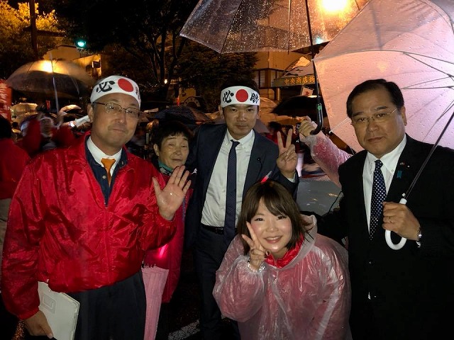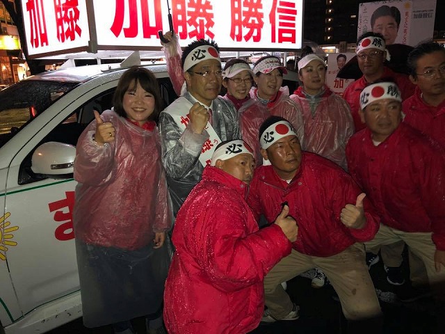 続いて、笠岡駅前へ移動。19時20分頃到着して、加藤勝信候補の駅前パレードとマイク納めに出席しました。候補者はもちろんのこと、ご家族、後援会の皆様、ご支援いただいた皆様、お疲れ様でした。ありがとうございました。感謝、感謝であります。