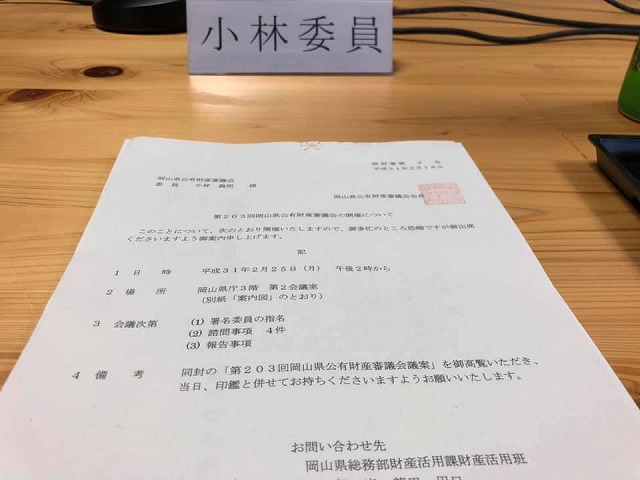 14時から、「県庁第2会議室」で開催された『第203回岡山県公有財産審議会』に出席しました。