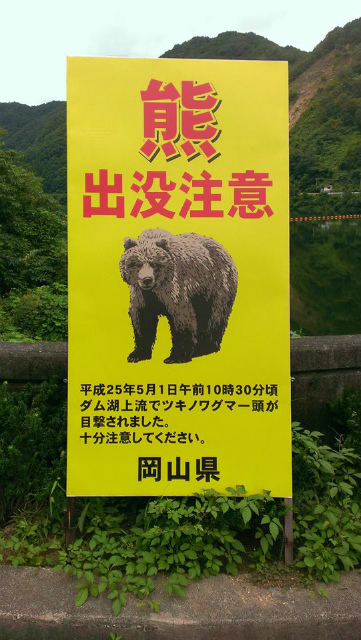 新見市内の河本ダム周辺で、こんな看板を発見しました。今年の5月1日に、このあたりでツキノワグマが目撃されたとのこと。そのため注意を呼びかたものであろうと思われます。しかし、このクマの写真は、どう見てもツキノワグマに見えないのであります。この写真のクマが本州で出没したのなら、大騒ぎでしょう。クマと認識されればいいのなら、いっそ「くまモン」にしたらどうだろう、岡山県。