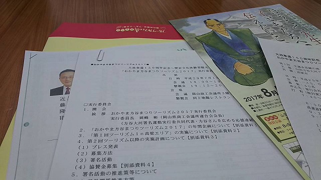 岡山市内へ移動して、18時から「岡山商工会議所」で開催された『大政奉還150周年記念~歴史文化体験型観光「おかやま方谷まつりツーリズム2017」実行委員会』に出席しました。新見市から、池田市長、藤沢副議長、榎市議、古川市議、岡崎市議、西川市議がご出席でした。勿論、「大佐山田方谷記念館」の磯田館長もご出席でありました。