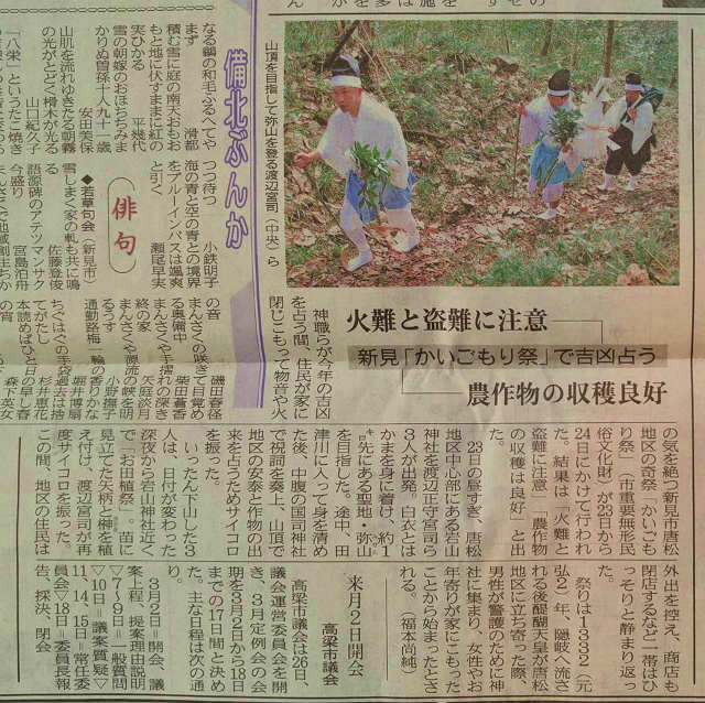 朝刊で、私が住まいする新見市唐松地区の奇祭『かいごもり』が取り上げられていました。