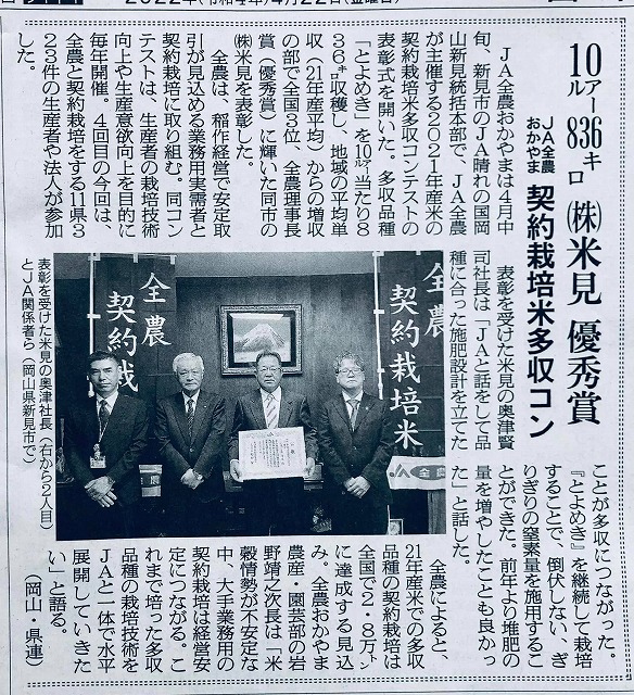 おめでとうございます。「日本農業新聞」が伝えている。
