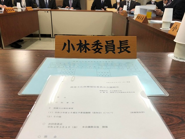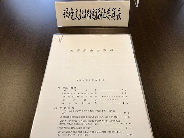 10時から「2月定例岡山県議会」再開。一般質問2日目です。昼休憩時間に、自由民主党「政務調査会」に出席。環境文化保健福祉部会長として、部会関係の陳情3件、条例案の説明。「2月定例岡山県議会」散会後、「環境文化保健福祉委員会」を開会。補正予算案について。