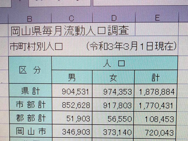 岡山県が毎月公表している「岡山県毎月流動人口調査」によると、県の人口は令和3年3月1日現在、187万8884人。住まいする新見市の人口は、2万7526人となっている。