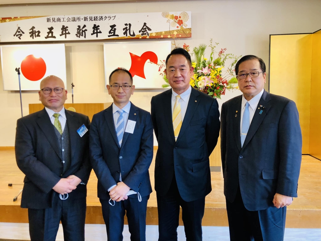 新見商工会議所並びに新見経済クラブの新年互礼会で。田中康信会頭、小林義和副会頭、黒田和成黒田商事社長と。