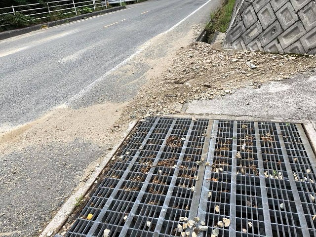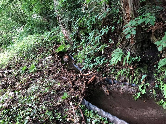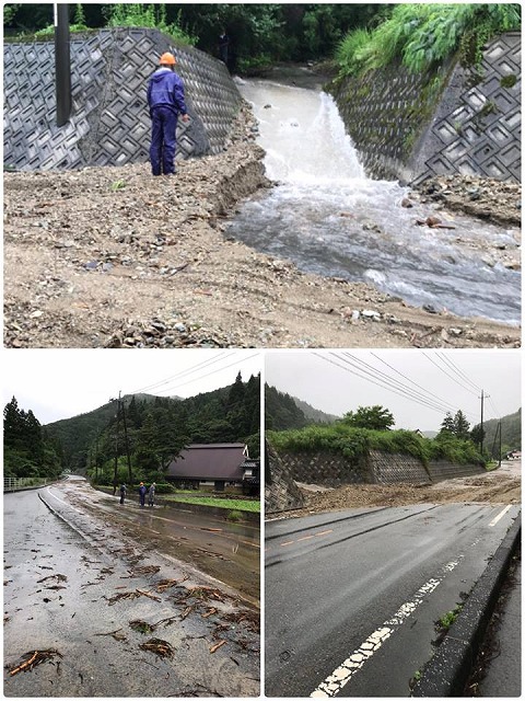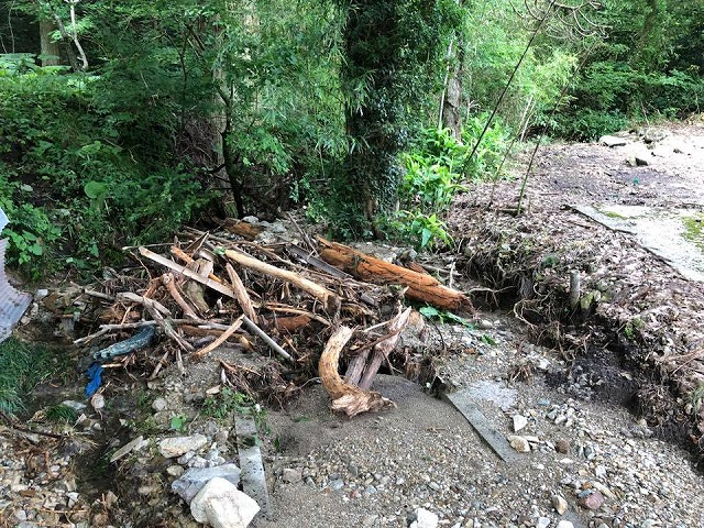 続いて、千屋実地区の皆様のご案内で、土石流が出た谷を視察しました。ここでも農業用水路が破壊されていました。将来的には砂防ダムが必要だと思いました。国道180号線に流れ出た当時の写真も掲載します。