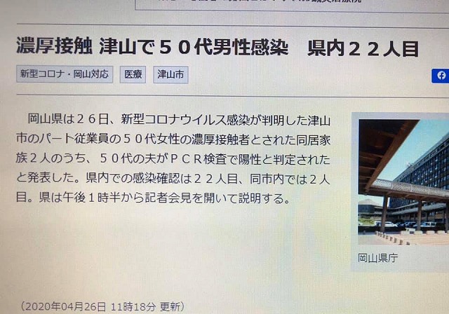 岡山県下で22例目の新型コロナウイルス感染確認のニュースです。ご注意願います。
