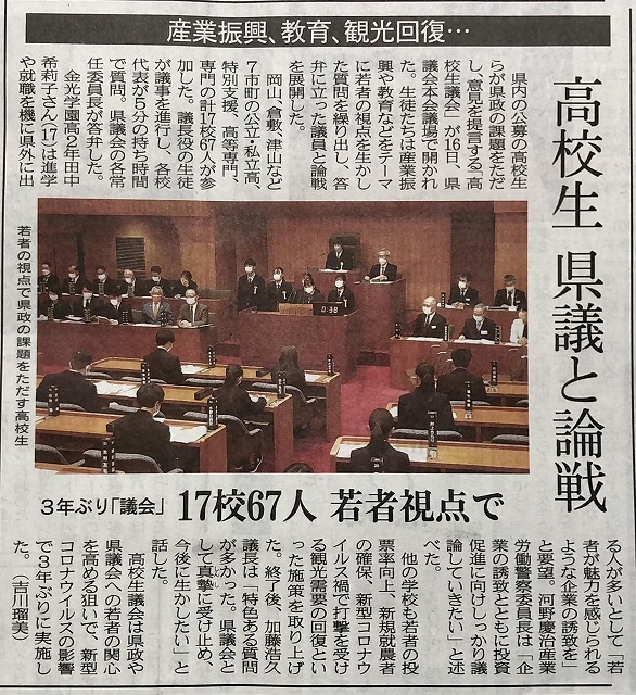 今朝の山陽新聞から、2題です。昨日開催の「高校生議会」のニュースです。