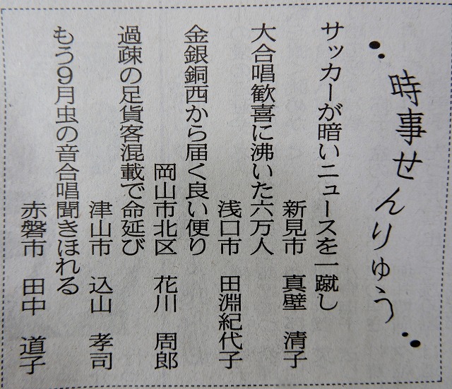 同級生真壁清子さん、おめでとうございます。9月2日の山陽新聞「時事せんりゅう」です。