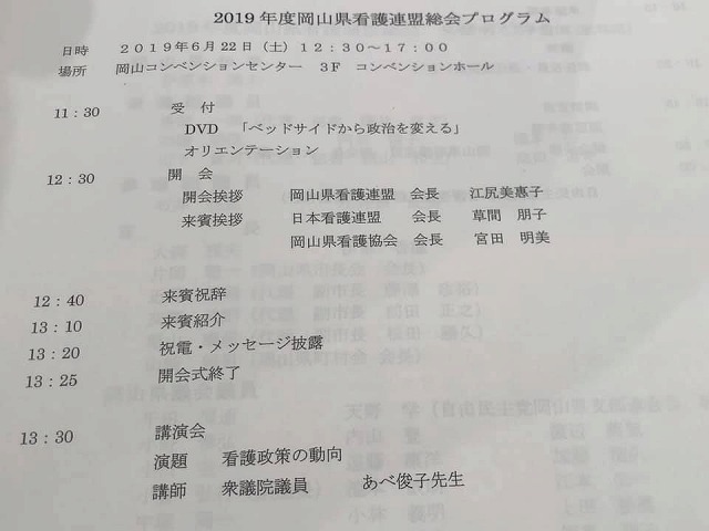 12時30分から、岡山市内で開催された『2019年度岡山県看護連盟総会』に出席しました。おめでとうございました。