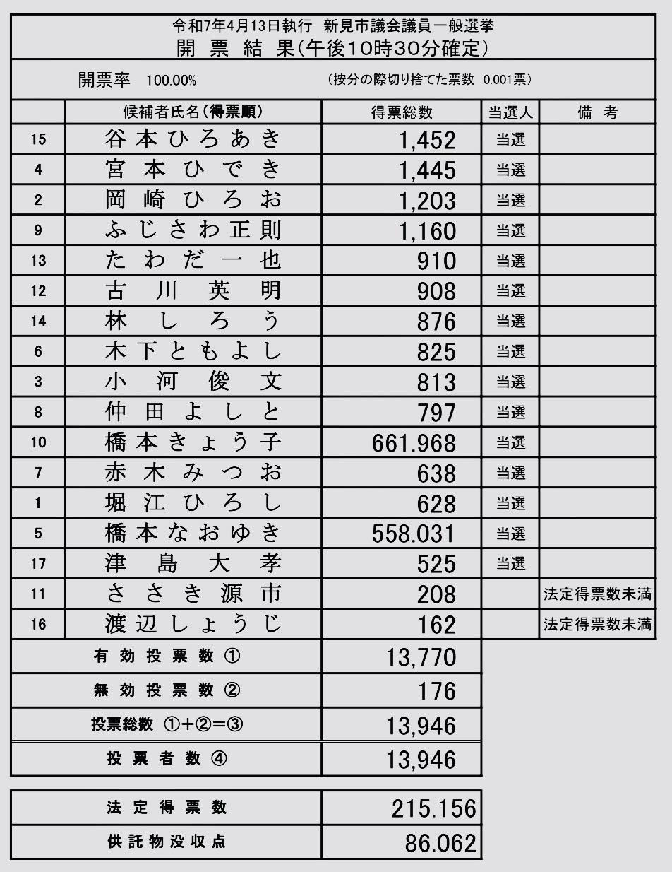 新見市議会議員選挙の開票結果です。ご当選されました皆様、おめでとうございます。