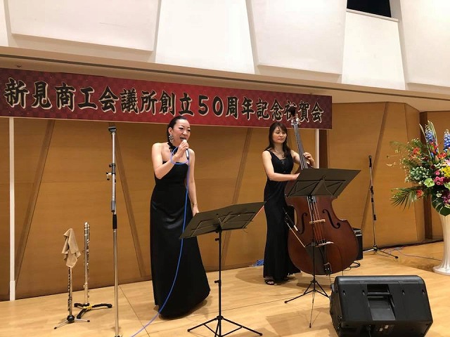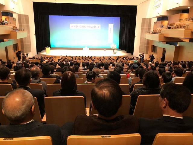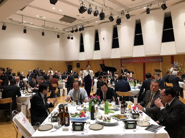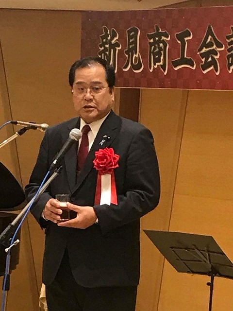 続いて、「まなび広場にいみ・小ホール」へ移動して、『新見商工会議所創立50周年記念祝賀会』が開催されました。乾杯の音頭をとらせて頂きました。「新見商工会議所創立50周年を寿ぎ、益々のご発展とご参会の皆様のご多幸ご活躍を祈念して、乾杯!」。