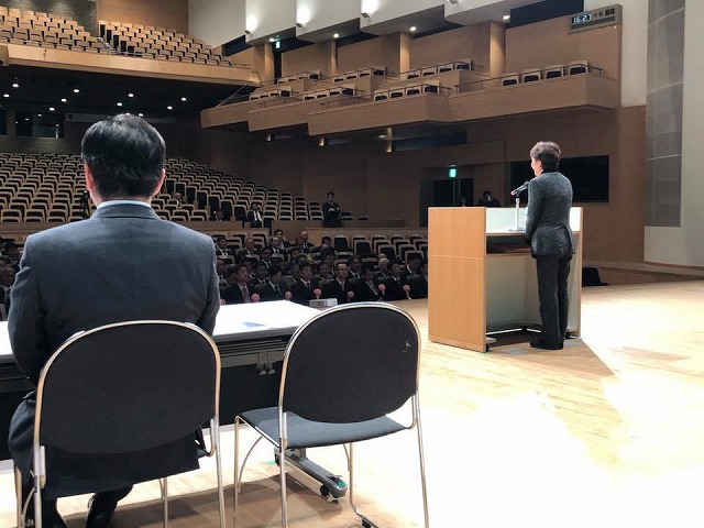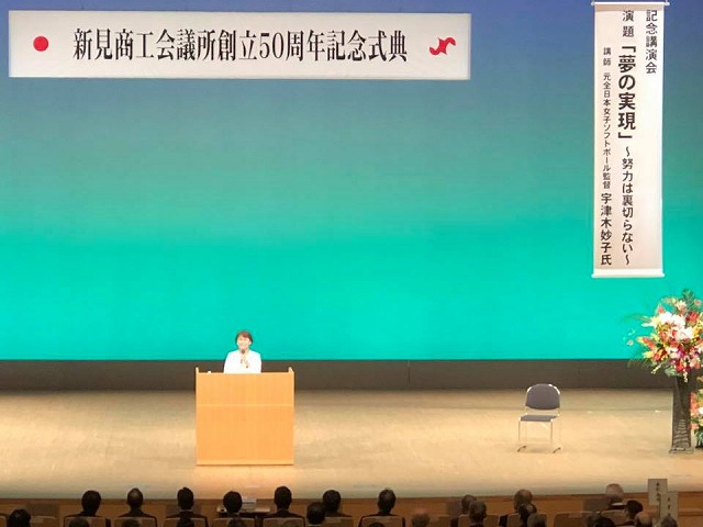 14時から、「まなび広場にいみ」で開催された『新見商工会議所創立50周年記念講演会』に出席しました。講師は、元全日本女子ソフトボール監督の宇津木妙子氏。演題は、「『夢の実現』~努力は裏切らない~」でした。実績に裏付けされた力強いご講演でありました。講演に入る前に、宇津木妙子氏のご紹介ビデオが上映されました。