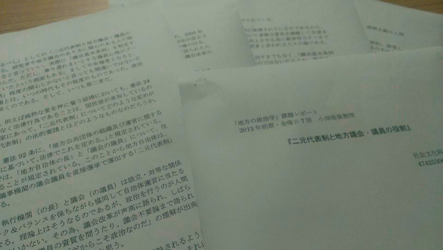 今日は午前中、『石井まさひろ本部事務所』当番でした。午後から県議会図書室で「二元代表制と地方議会・議員の役割」についてのレポート作成。18時30分まで。実に勉強になった。19時40分から大学院の講義。23時ごろに帰宅しました。