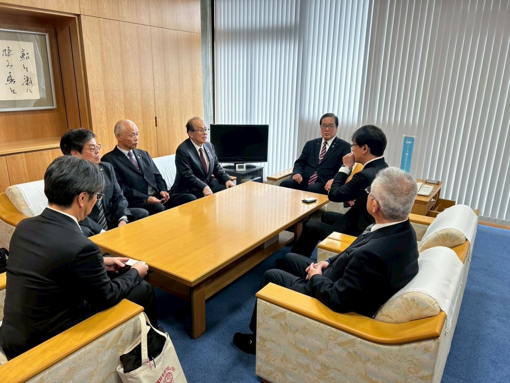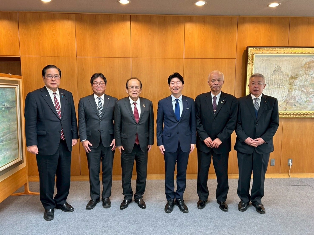 新見市の石田市長、根石副市長、藤沢議長、後藤教育長が、年始のご挨拶で岡山県庁に来られました。チーム新見で頑張ろう!であります。知事、副知事、県警本部長に年始のご挨拶です。